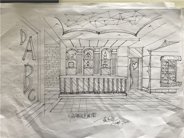 這是成都輝瑞大成設(shè)計(jì)總監(jiān)黃兩泉為云南威信錢柜KTV畫的臨時(shí)手繪圖,黃總監(jiān)擁有極強(qiáng)的藝術(shù)修養(yǎng),擅長(zhǎng)將藝術(shù)的審美經(jīng)驗(yàn),轉(zhuǎn)化成設(shè)計(jì)動(dòng)力。多年室內(nèi)設(shè)計(jì)領(lǐng)域探索經(jīng)驗(yàn),一直致力于東方傳統(tǒng)美學(xué)精神與當(dāng)代設(shè)計(jì)手法碰撞,帶領(lǐng)設(shè)計(jì)團(tuán)隊(duì)開拓多元化的設(shè)計(jì)實(shí)現(xiàn)。你可撥打電話預(yù)約設(shè)計(jì):136-5805-6661,可免費(fèi)平面設(shè)計(jì)和初步預(yù)算報(bào)價(jià)。 好的手繪圖可以反應(yīng)一個(gè)設(shè)計(jì)師的素養(yǎng),這個(gè)項(xiàng)目1000平方,黃總監(jiān)手繪圖快速直觀的反應(yīng)KTV設(shè)計(jì)造型結(jié)構(gòu),也是希望給客戶呈現(xiàn)更好的效果,后期還要加工處理畫出3D效果圖,請(qǐng)盡情期待吧!