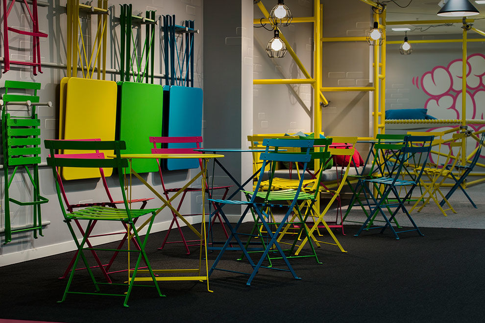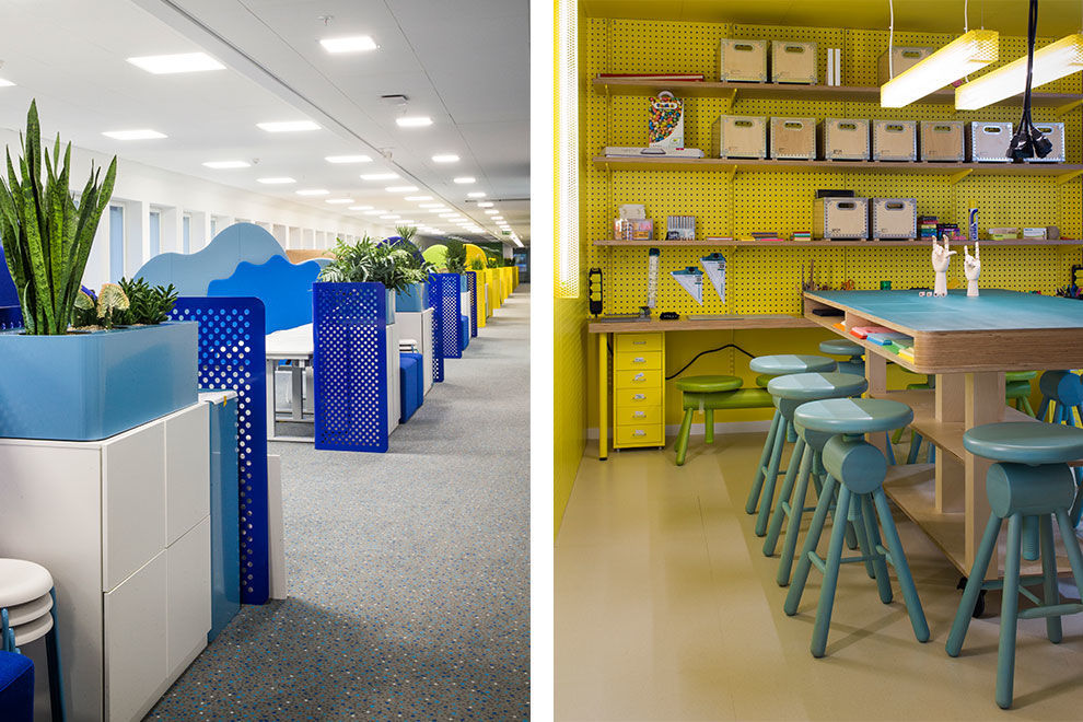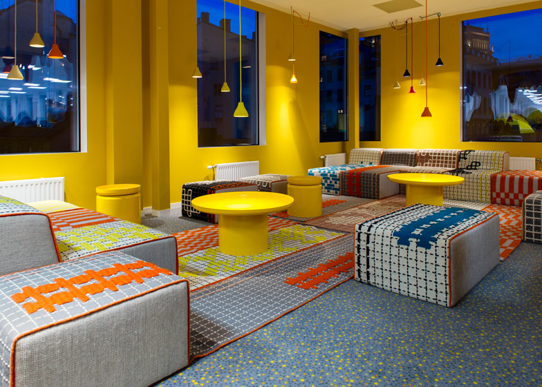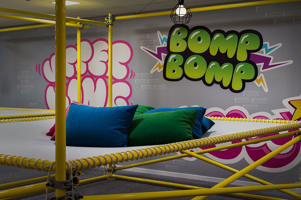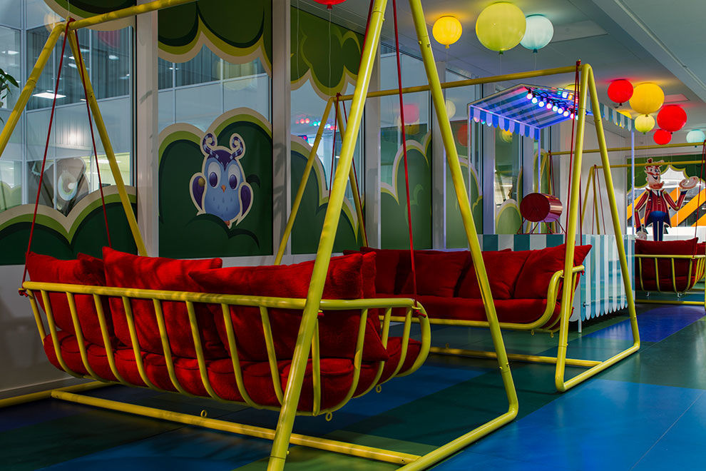 這里的一切與我們常見的辦公空間設(shè)計案例不太一樣,顏色、形狀、布局都跳脫出了辦公空間的慣有模式,高飽和度的明麗色調(diào)、充滿親和力與童話色彩的家具風格,使得它看上去更像是一個專門為孩童設(shè)計的空間,包括蛋形的前臺、旋轉(zhuǎn)木馬樣式的用餐具、蹦床一般的座位等。