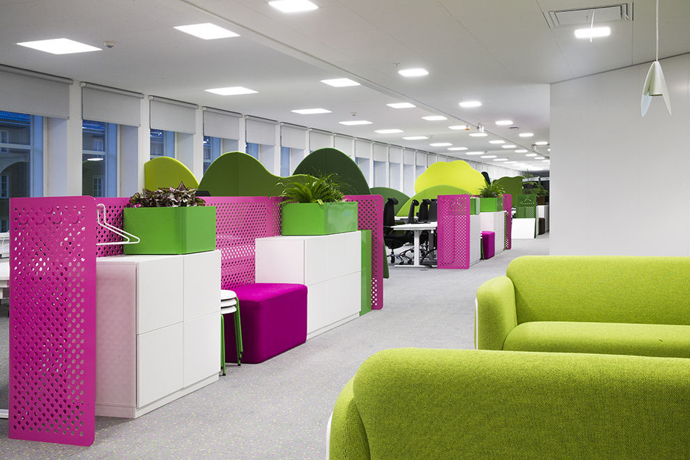 這里最大的一個空間被稱為「Pavilion Park」,主要承擔舉辦各式派對的功能。而主要的工作區(qū)域也都各有其名,比如:魔法森林(Magic Forest)、 青山(Green Hills)、寶島(Treasure Island), 鄉(xiāng)村(Countryside )以及深海(Deep Sea)等等,每個區(qū)域都有其獨立的會議室、私人辦公間以及休閑區(qū)。“ King 的工作方式很靈活,我們?yōu)槠湔业降慕鉀Q方案就是創(chuàng)建不同的可以靈活改變大小與位置的空間,既適用于快速組織的小型會議,也適合一些較長參加人數(shù)較多的大型會議。” Adolfsson & Partners 團隊解釋說。