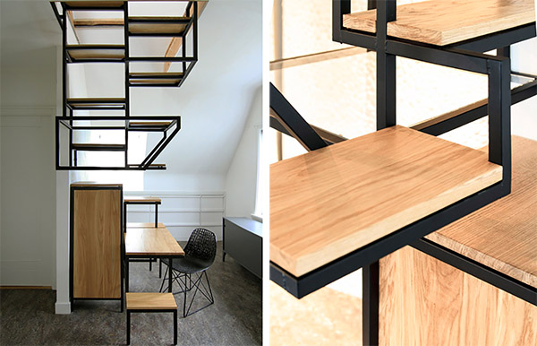 荷蘭設(shè)計(jì)師Mieke Meijer打造了一個(gè)具有儲(chǔ)物功能的樓梯。這個(gè)樓梯分兩個(gè)部分,上部高低兩排的懸浮鏤空結(jié)構(gòu)使其在具備儲(chǔ)物功能的同時(shí)也方便行走,而下部由儲(chǔ)物柜和辦公桌組成。這樣的設(shè)計(jì)方式在考慮樓梯自身功能的同時(shí),也有效的利用了空間。