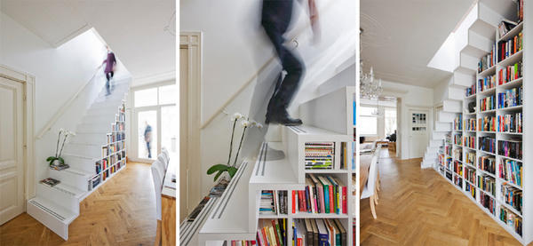 位于荷蘭阿姆斯特丹的marc koehler architects利用樓梯一層層的規(guī)則,分割出大小一致的方格,把樓梯下的三角空間充分利用成書架,不但可以收納更多書籍,而且剛好在餐桌前,面對一整面書墻用餐,不比盯著電視差喔。